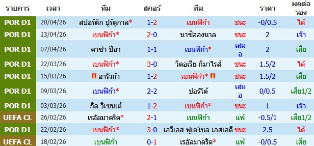 ผลงาน 10 นัดหลังสุดของทีม เบนฟิก้า
