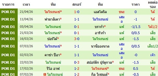 ผลงาน 10 นัดหลังสุดของทีม โมไรเรนเซ่