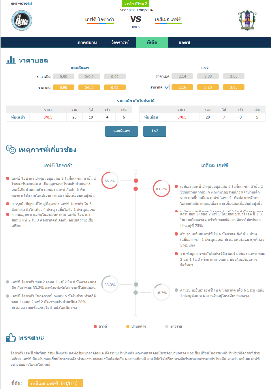 วิเคราะห์บอล [ เจแปน เจ-ลีก ดิวิชั่น 2 2026 ] เอฟซี โอซาก้า vs เอฮิเมะ เอฟซี admin เมษายน 17, 2026 วิเคราะห์บอลคืนนี้ / วิเคราะห์บอลวันนี้ / ทรรศนะฟุตบอลประจำวัน แนะแนวเรื่อง Previous Previous post: วิเคราะห์บอล [ กระชับมิตรทีมชาติ 2026 ] คอสตาริกา (ญ) ยู 20 VS แคนาดา (ญ) ยู20Next Next post: วิเคราะห์บอล [ เอเอฟซี แชมเปี้ยนส์ลีก อีลิท 2025-26 ] อัล อาห์ลี vs ยะโฮร์ ดารุล ทักซิม