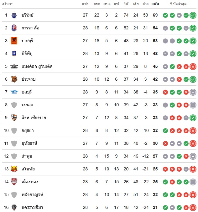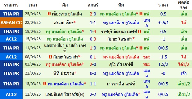 ผลงาน 10 นัดหลังสุดของทีม แบงค็อก ยูไนเต็ด